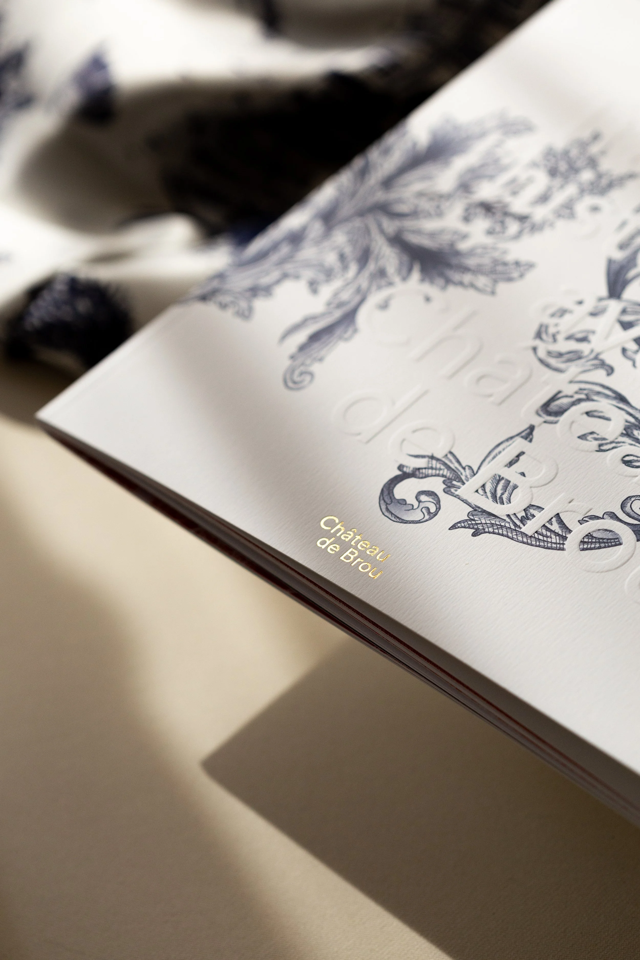 Une identité sobre et épurée, pour refléter l’élégance du lieu, qui est portée par une toile de Jouy réalisée sur mesure pour le projet. Celle-ci est entièrement composée d’éléments phares du domaine, dans la volonté de valoriser les existants et conserver l’authenticité des lieux. À cela s’ajoute une iconographie discrète, à base de symboles comme les clés croisées qui fait écho au mystère qui plane sur ce lieu.